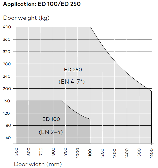 The operators ED 100 and ED 250 are suitable for most swing doors provided that the combination of door width and door weight lies within the defined functional area.